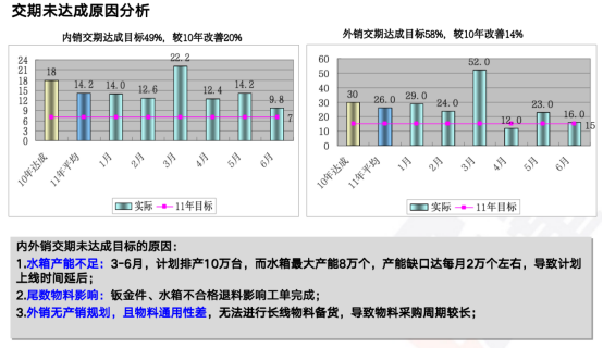 通過對配件車間內(nèi)油壓機,火排沖壓設(shè)備,火排裝配線,水箱沖壓設(shè)備,小U開料設(shè)備,總裝車間備料區(qū)等設(shè)施進行重新規(guī)劃、調(diào)整,減少車間一次物流距離1500M,在制品面積下降63%,庫存金額下降50%。通過燃熱產(chǎn)品部物與情報現(xiàn)狀圖與理想圖對比,得出目前存在的問題并設(shè)置改善對策。